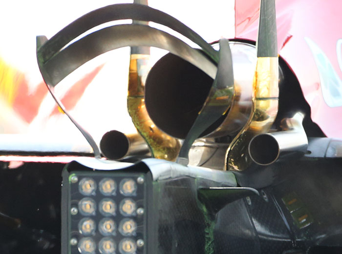 Ferrari experimented with a few different designs of winglet mounted on the rear impact structure, downstream of the tailpipe – a twin element design (above) and a triple (below). Note the gold heat shielding on the wing support.