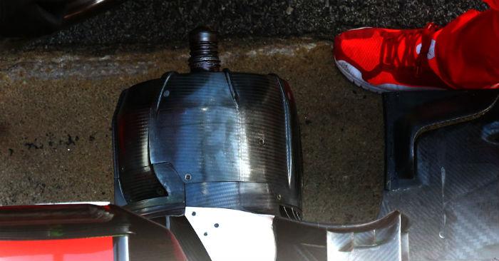 With the bodywork removed it is clear to see that Ferrari has carried over the concept of its cooler layout from 2016, with its distinctive V shape. Haas is the only other team to utilise such a layout.