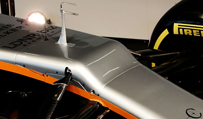 As is the case with the Williams, Sauber and Renault designs the VJM10 features the same centreline cooling concept used by Mercedes in 2016. This sees the MGU-H and MGU-K cooler located in the centre of the car above the bellhousing. This means a new roll hoop concept has to be used and like the 2016 Mercedes the roll over structure is mounted inside the duct, with the A shaped design clear to see, and a single support mounted centrally.