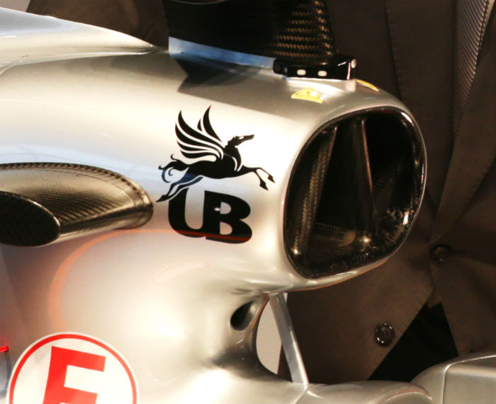 The duct is segmented into three parts the outer two segments feed air to the ERS cooler, while the central segment feeds combustion air to the Mercedes V6 engine. Another smaller cooling aperture is mounted below the main duct.