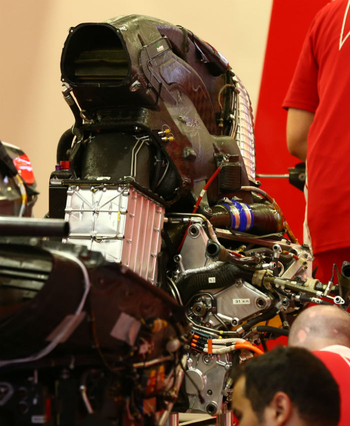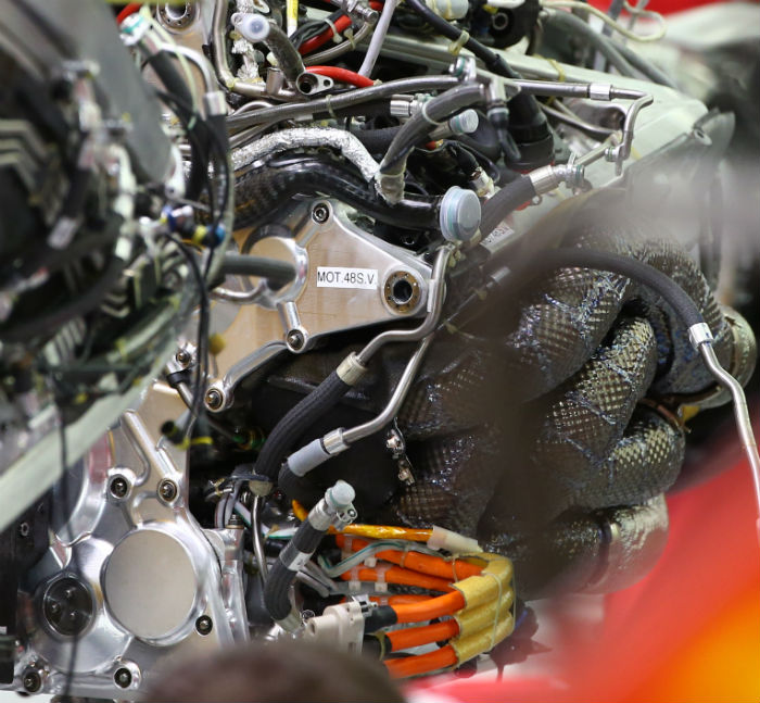 The airbox has been reworked, along with the air filter, and the plenum is also new. A new charge air cooling arrangement appears to be utilised. Both crankcase and cylinder head castings differ, probably due to the increased loads both have to withstand in 2017. The (orange) high voltage cabling for the ERS has been re-routed.