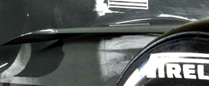 From a different angle however it is clear to see that the element is curved downwards and appears to have some sort of influence on the airflow around the leading edge of the sidepod, Mercedes also has a similar component on the W08, though different in design.
