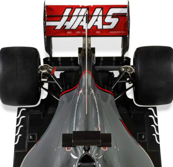 A good look about the rear wing and diffuser of the Haas. Note the detail design of the end plates with the serrated lower section. Also of note is the slotted section on the lower part of the leading edge.