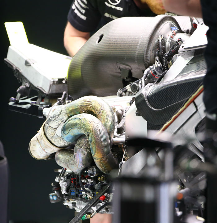 A look at the bargeboard arrangement of the MRT06, it appears less complex than those seen on many cars on the 2017 grid, perhaps a reminder that work on the car stopped months before others did. Note the sidepod duct shape, it appears to be smaller than that used on the MRT05, despite cooling requirements increasing in 2017. Team sources claim that the 2016 car was actually over cooled allowing the sidepod size and duct size to be reduced.