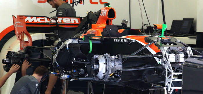 McLaren remains the only team in the F1 paddock to use Akebono brake calipers. Here we can see the rear brake setup with the caliper mounted at the base of the (removed) disc. It has a composite covering. Note the many aerodynamic elements on the inner face of the assembly.