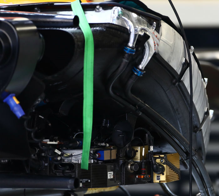 The rear suspension layout is clear to see with the pullrod evident. Interestingly what appears to be the top of one of the torsion bars is visible in this image on the top left next to the wastegate exit and a long way from the pullrod. It will be very interesting to see the full rear suspension layout of the MCL32. Note how the wastegate exit pipe has to curve around the suspension elements.