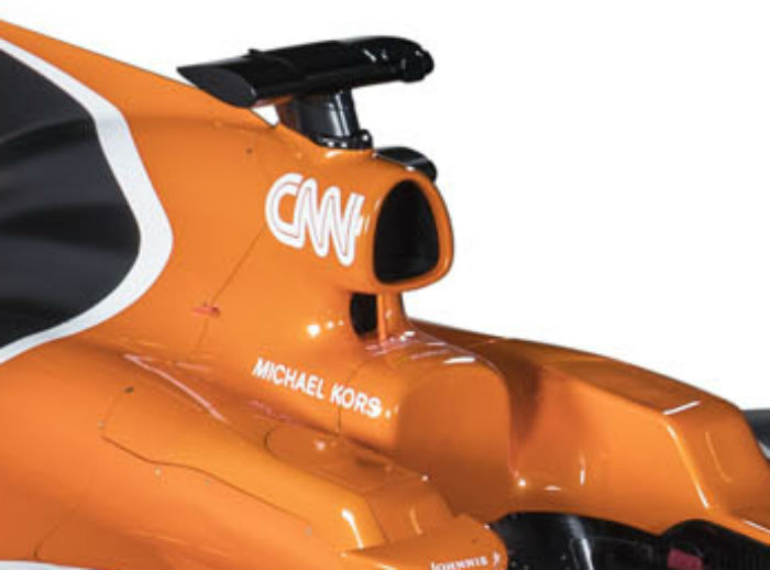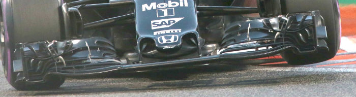 The nose on the MCL32 is vented as was the case with the MP4-31, but this time the exit on the top of the nose is not split by an antenna. Note the shape of the parts around the bargeboards.