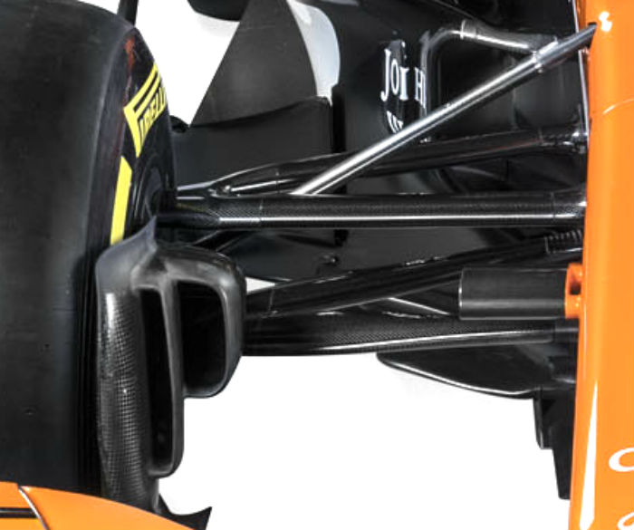 McLaren ran with this semi cylindrical part at the rear of its floor in testing, it is not clear if this is to check the tyres clearance to the floor or if it is an aerodynamic component.