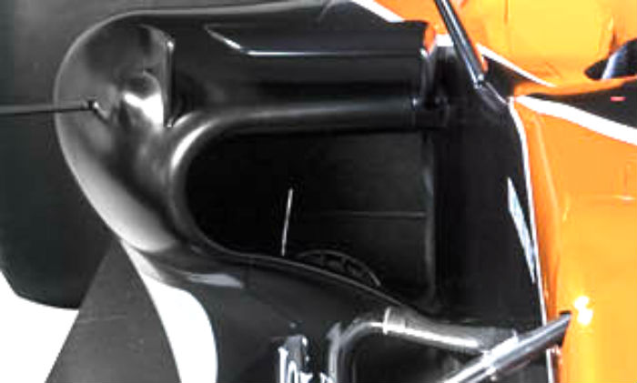 At the launch of the car it was apparent that the two cooling ducts on the sidepods of the car differed from one another slightly. The left hand side duct (above) has a small scoop for cooling components stored under the sidepod duct, as does the right hand side (below), but the scoop is a totally different shape and size.