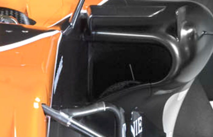 The roll hoop on the MCL32 is fairly conventional and follows the general concept of that used on the MP4-31 with the main duct split between cooling and combustion gas, while a smaller central cooling duct is located below the main duct.