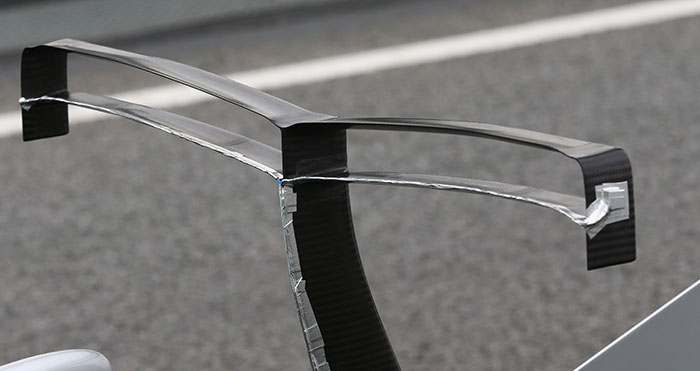 The trailing edge of the rear impact structure is fitted with a carbon fibre extension complete with a saw tooth edge.