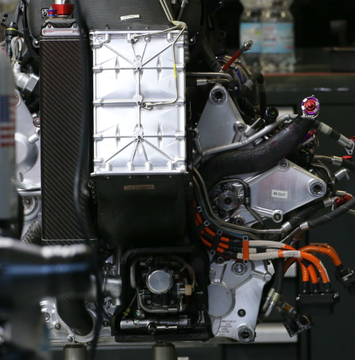 A look at the front end of the 2016 Ferrari power unit reveals a charge air cooler at the front of the engine block. The oil tank is on the right hand side of the front of the block.