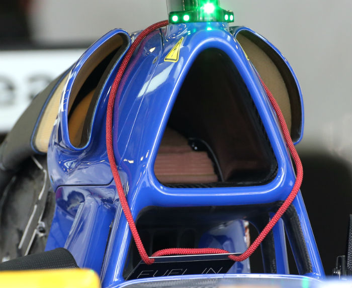 One of the most striking details of the Sauber C36 is its lack of a roll hoop, instead of having the conventional hoop as a roll over structure with the main combustion air intake in the centre of that hoop the Sauber features a ‘blade’ with the air intakes for cooling and combustion either side of it. The central structure is the component which passes the crash tests and is meant to protect the driver in the event of a roll over accident.