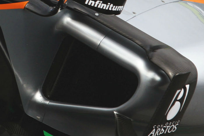 The VJM09 (above) has notably smaller and reshaped sidepod ducts compared to the VJM08 (below). This could suggest that the 2016 Mercedes power unit requires less cooling or that Force India is willing to be a little more aggressive in this area.