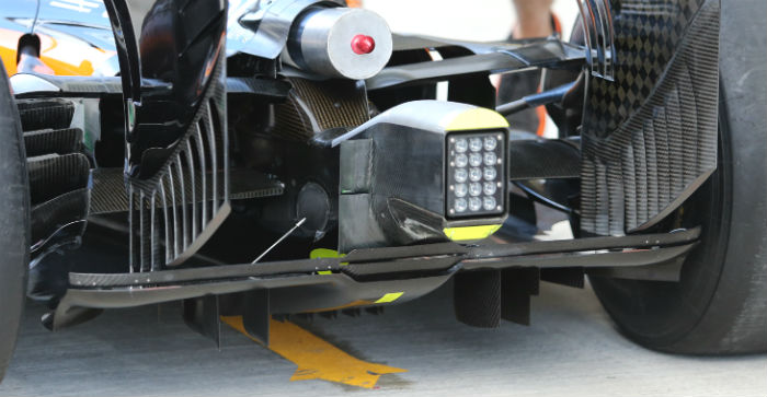 Force India introduced a clever new nose part way through the 2015 season. Inside the openings are a pair of spoon-shaped underbody panels that brings the air slightly more inboard and improves the channelling of air under the chassis. These panels are crucial to the legality of the vents. Beginning as an attempt to reduce the length of the nose and increase aerodynamic performance Force India discovered that the basic architecture of the chassis, around the front suspension, prevented any potential for a very short nose.