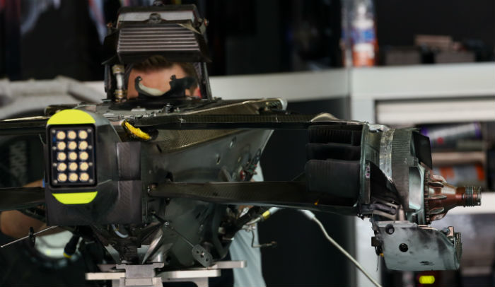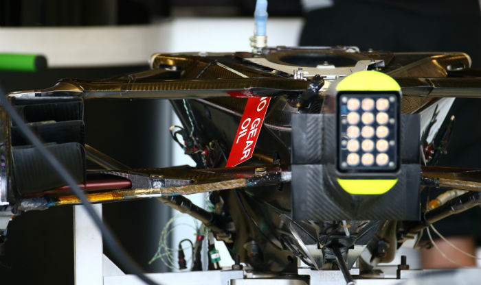 Another look at the Mercedes transmission used on the Force India which has a composite outer case and a metal inner section which can just be seen in a couple of points in his image. Note also the caliper position on the rear brake.