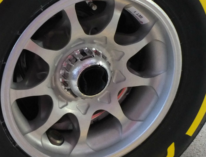 The front wheels/uprights of the VF-16 feature so called ‘blown’ wheel nuts, with a channel through the centre.