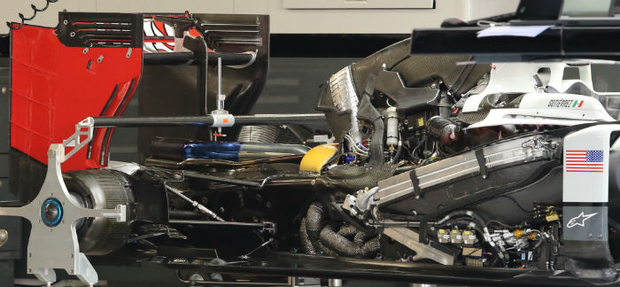 Looking at the rear wing it is largely identical between the two (Ferrari above, Haas below) but note that the rear wing support does differ.