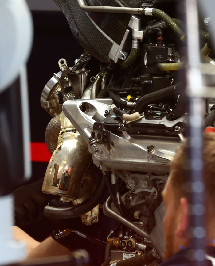 Here we can see the new ‘B’ specification V6 motor (or moteur if you feel a bit French), the exhaust has been removed, and the MGU-K made by Marelli is clear to see, the overall design