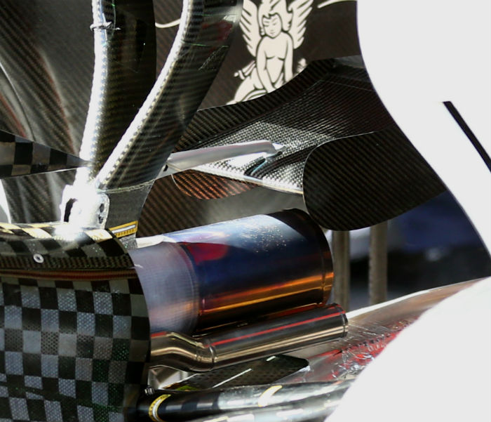 One version (above) featured a single metal central support linked to the base of the Y shaped part of the rear wing pylon. Note the kink in the wastegate exit, a feature common to all of the 2016 Ferrari powered cars.