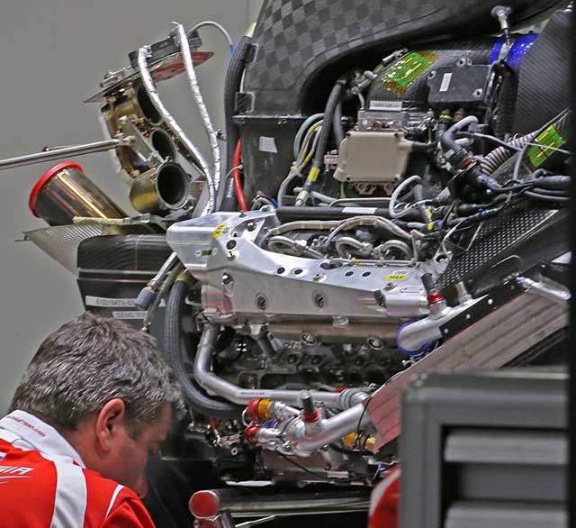 With more components removed the Ferrari V6 engine is obvious. The sheer complexity of this new generation of car is incredible and its obvious why it is hard to get them to work correctly. Note the waste gate pipes (sans waste gate)