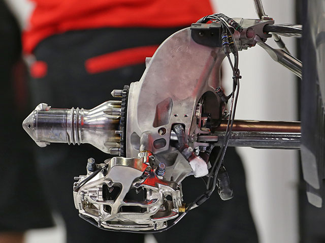The exterior of the spacer plate can be seen here with by looking at the panel lines on the car. The forward front wishbone points remain as they were in 2014 but now there is a short extra section ahead of the nose.