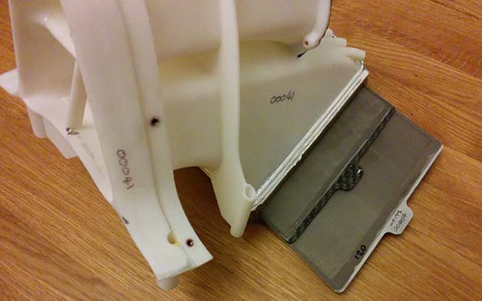 The unusual T-Bar style roll hoop support and cooler arrangement has been retained on the updated MR03 (seen above in 2014) this duct feeds into centrally mounted coolers which allow for the side pod volume to be reduced. The internal layout of this pipe work became apparent when the components of the 2014 MR03 and Manor MNR1 wind tunnel models were sold off at auction. Note the flow conditioners inside the lower duct (above).