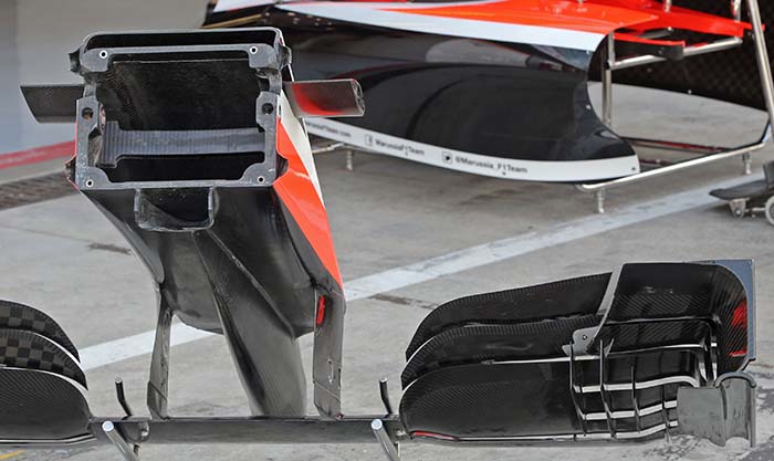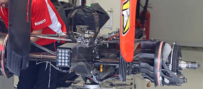 Here we get a look at the inboard suspension pickup points on the Ferrari transmission used by Marussia. Note the base of the y-lon rear wing support on the top of the rear crash structure. Something many teams copied during the season but was pioneered by Marussia.