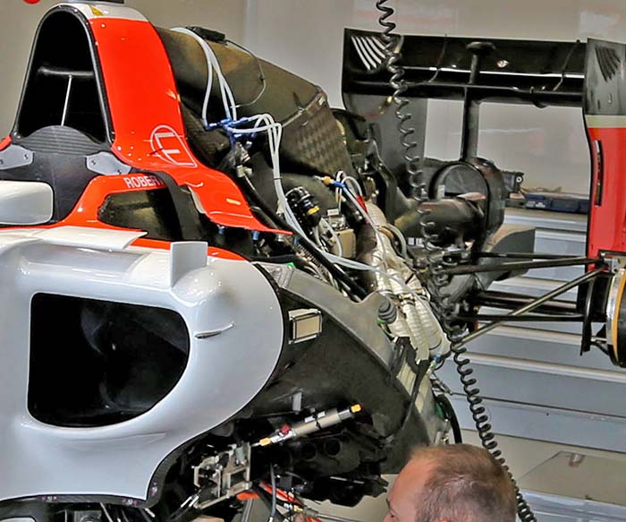 Under bodywork little has changed on the MR03’s the 2014 specification Ferrari power unit is present – with its late season exhaust wrap in evidence, as is the 2014 Ferrari transmission.