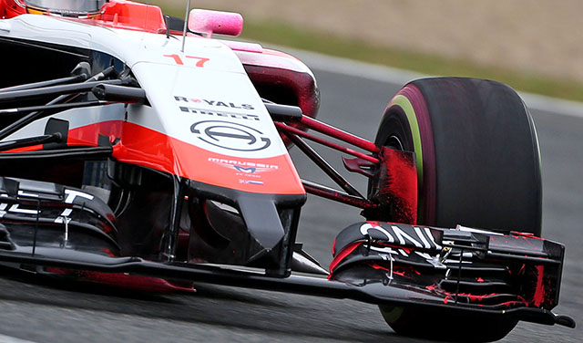 Marussia used some of its restricted running at Jerez to do some flow vis running, note the red dye on the front wing, then the spray collecting on the splitter, wing mirror, brake duct and wishbones.