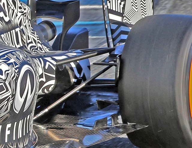 The RB11 retains the pull rod actuated rear suspension that has been a feature of all recent Red Bull cars. Note the extreme undercut at the rear of the car.