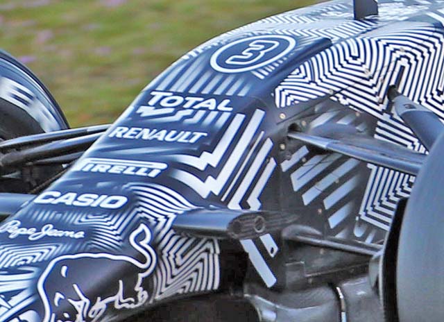 The front bulkhead of the RB11 is fairly large compared to some other 2015 cars. It still features a duct as was the case with the RB10. The entry ducts have been extended from the base of the nose to the side, as can be seen below.