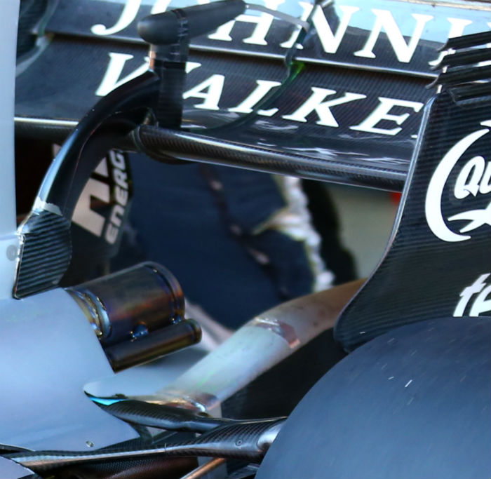 The duct is segmented into three parts the outer two segments feed air to the ERS cooler, while the central segment feeds combustion air to the Mercedes V6 engine. Another smaller cooling aperture is mounted below the main duct.
