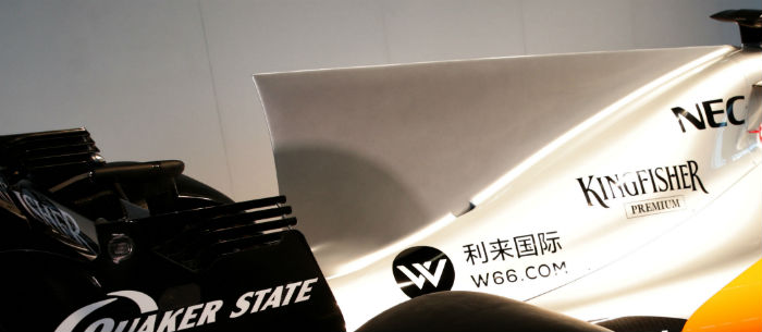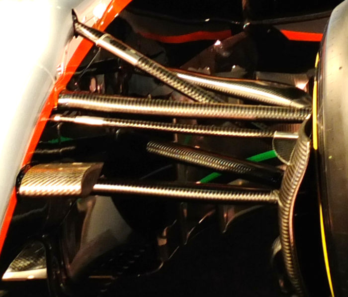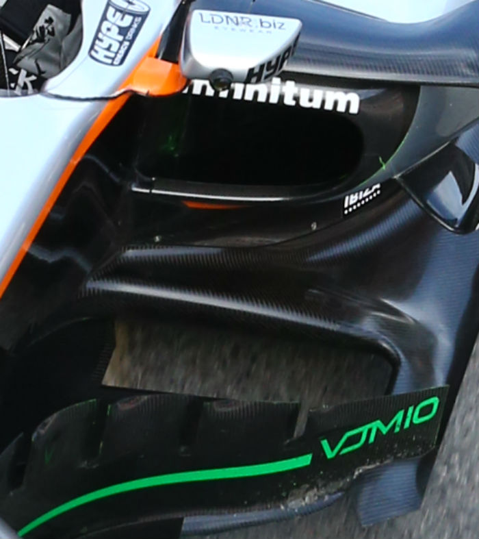 As with most recent F1 cars the VJM10 features an aerodynamic element around the leading edge of the sidepod, but unlike some it does not reach to the floor of the car.