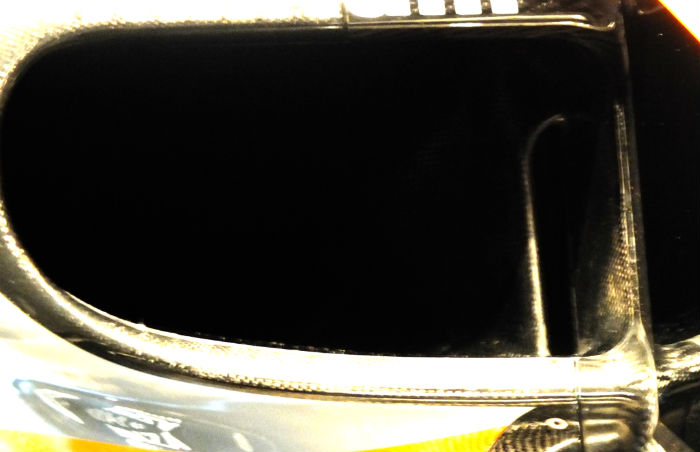 The side pod ducts on the VJM10 appear to differ slightly side to side, both feature internal scoops to channel air to systems under the engine cover, but the scoop on the left side (above) appears slightly larger than that on the right (below)
