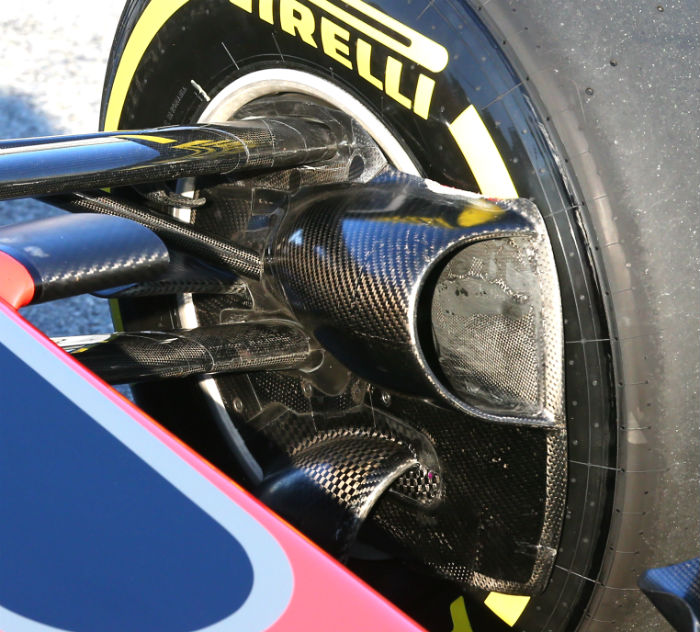 In 2017 most cars on the grid have much larger barge boards than they did in 2016, a result of the new aerodynamic regulations. The Haas is no different in this respect and has a complex array of turning vanes and flow conditioners in the region behind the front wheel.