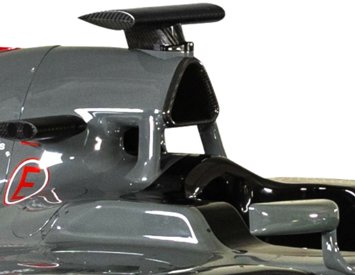 From a different angle however it is clear to see that the element is curved downwards and appears to have some sort of influence on the airflow around the leading edge of the sidepod, Mercedes also has a similar component on the W08, though different in design.