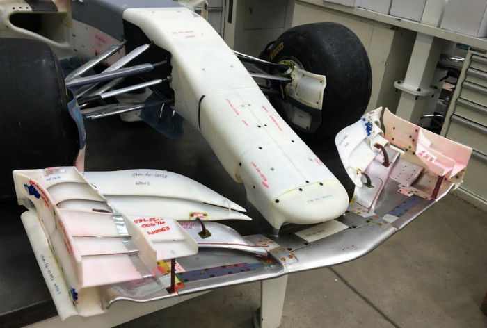 The MRT06 likely started life in the wind tunnel using a heavily updated version of the 2016 wind tunnel model (above). This model had something of an interesting life, it started out being built in 2014 for use on the development for the ultimately stillborn MNR1 / MR04 2015 design (below).