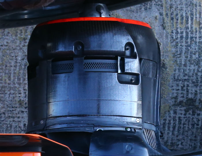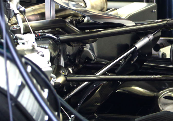 The rear suspension layout is clear to see with the pullrod evident. Interestingly what appears to be the top of one of the torsion bars is visible in this image on the top left next to the wastegate exit and a long way from the pullrod. It will be very interesting to see the full rear suspension layout of the MCL32. Note how the wastegate exit pipe has to curve around the suspension elements.