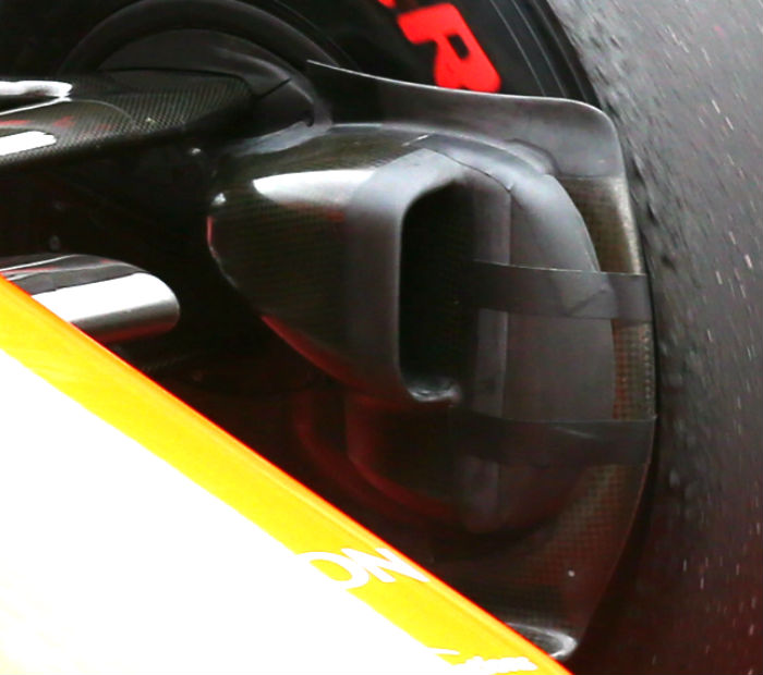 At the launch of the car it was apparent that the two cooling ducts on the sidepods of the car differed from one another slightly. The left hand side duct (above) has a small scoop for cooling components stored under the sidepod duct, as does the right hand side (below), but the scoop is a totally different shape and size.