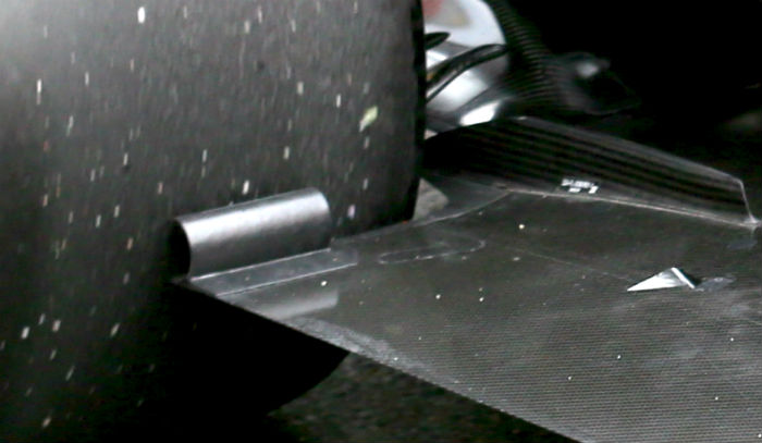 McLaren ran with this semi cylindrical part at the rear of its floor in testing, it is not clear if this is to check the tyres clearance to the floor or if it is an aerodynamic component.