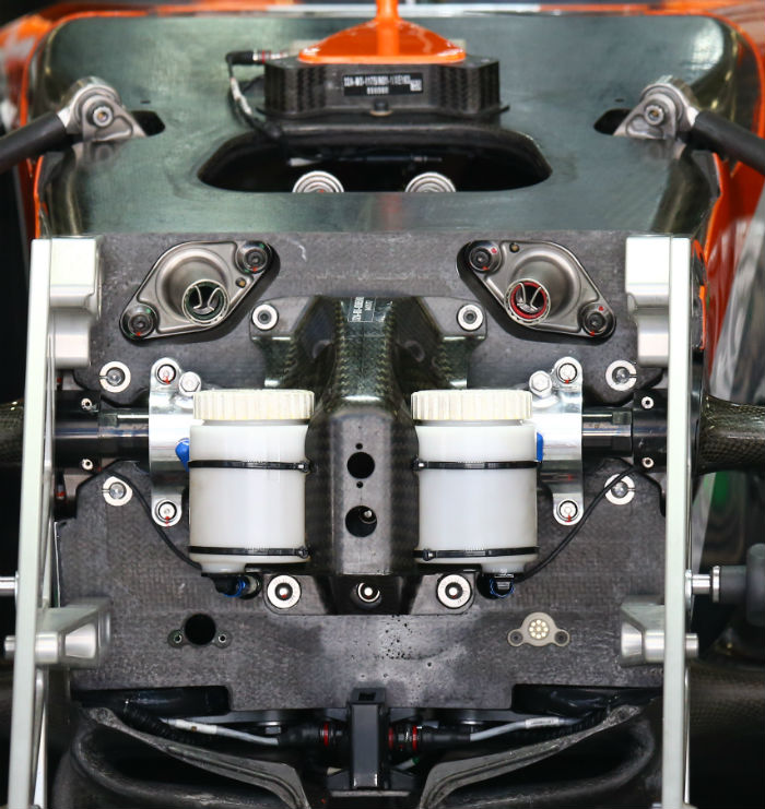A look at the front bulkhead of the MCL32. The torsion bars are clear to see, with a curious outward angle. The inboard pushrod pickup point reveals the rough location of the far end of the bars.