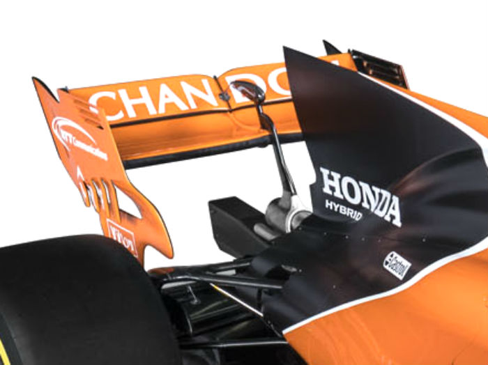 A look at the rear of the MCL32 shows the rear wing mounting, and McLaren seems to have dropped the idea of passing the support through the tailpipe used on the MP4-31, in favour of a more conventional mounting. The pull rod rear suspension layout is visible also.