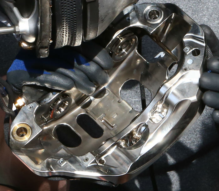 The calipers themselves are made of an aluminium alloy though Akebono declines to reveal much more about them. Looking at this image though it can clearly be seen that the fronts at least are a six piston design.