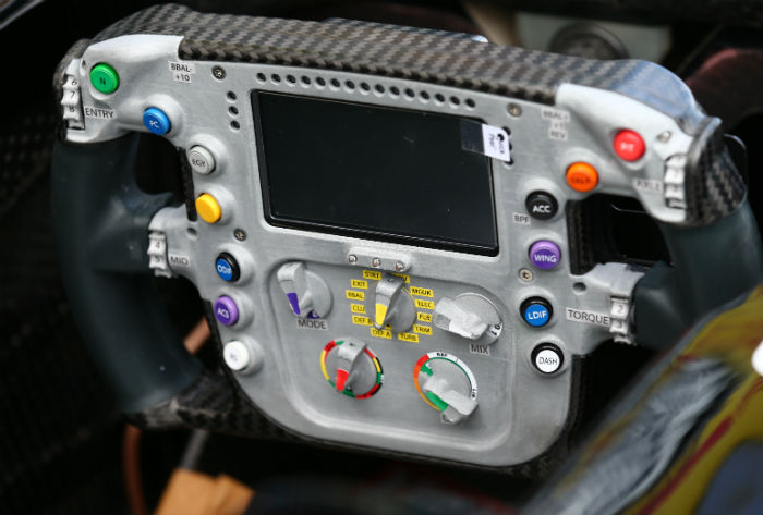 A look at the steering wheel of the VJM09, which has a 3D printed centre panel mounted in a carbon fibre shell.