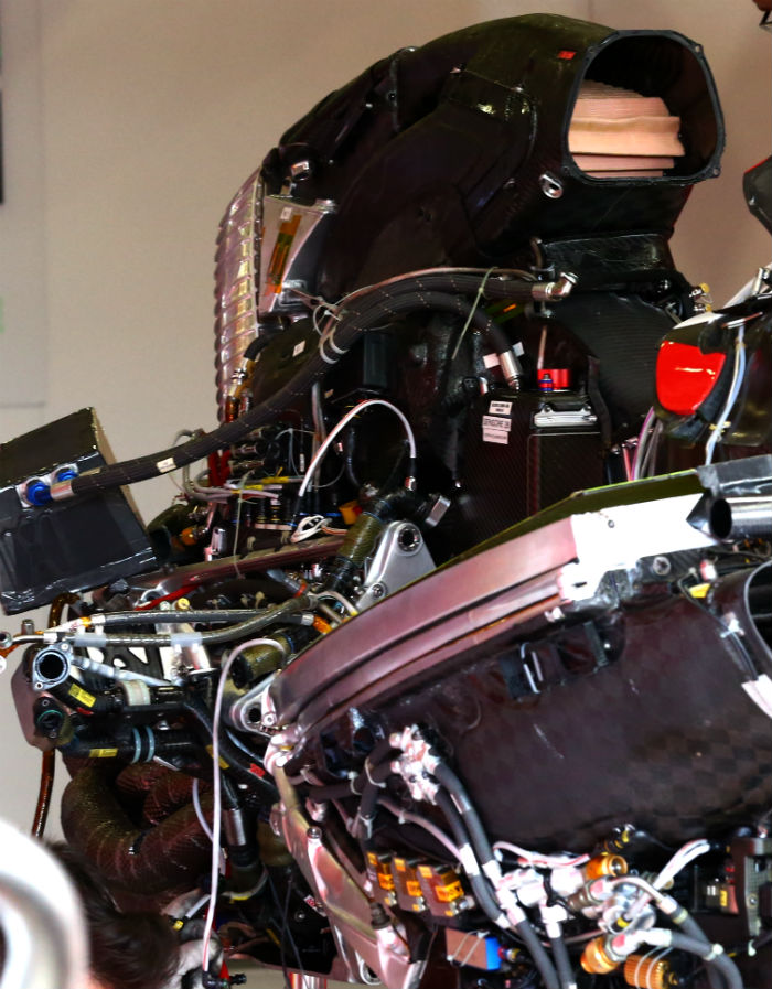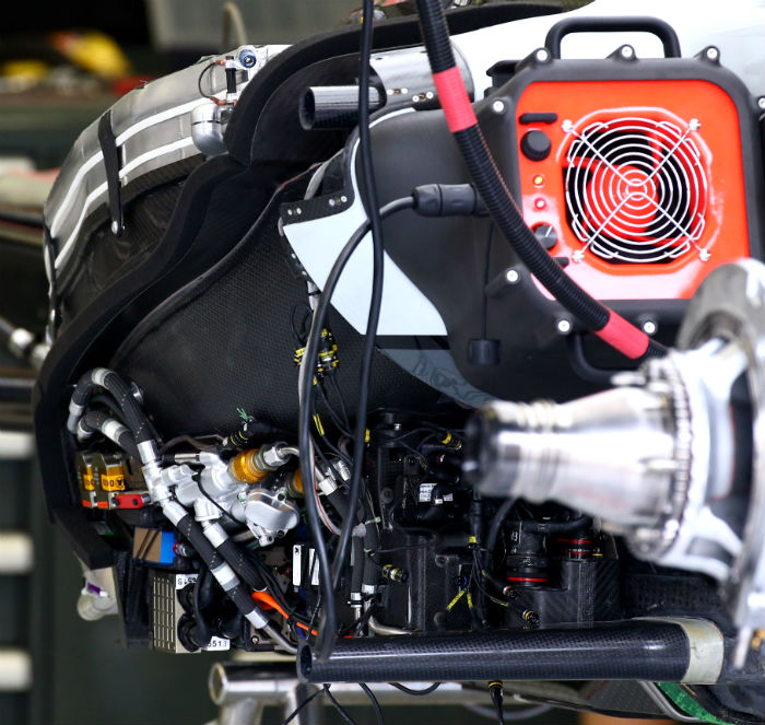 Under the skin of the sidepod the usual side impact structure is visible as is the array of electrical control boxes and some hydraulic actuators.
