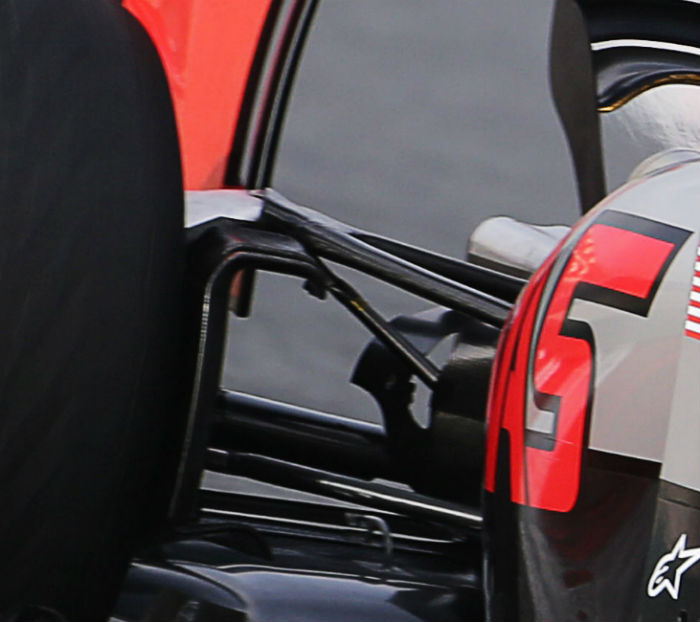 compare the Ferrari (above) to the Haas (below) the brake duct design is also identical as are the wishbones. The nose concept differs however between the two cars.