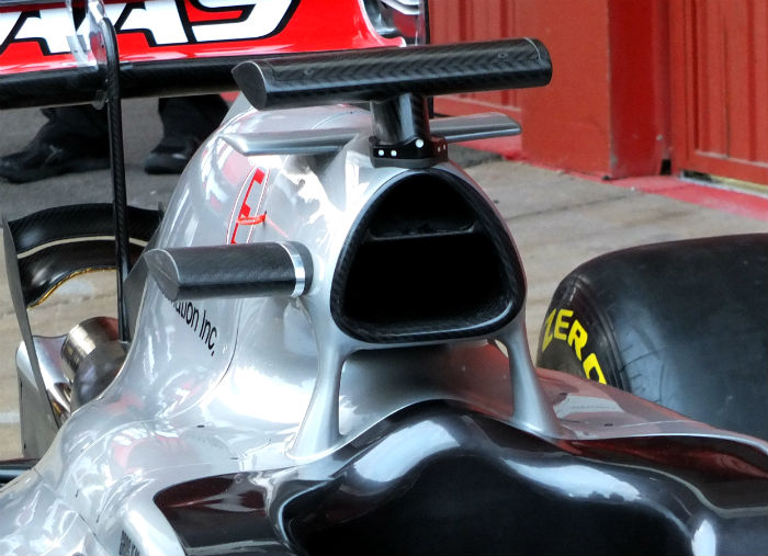 Below is another look at the roll hoop and airbox design on the Haas, the under hoop cooling duct is just visible.
