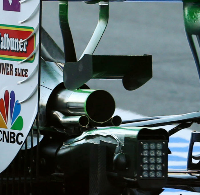 One version (above) featured a single metal central support linked to the base of the Y shaped part of the rear wing pylon. Note the kink in the wastegate exit, a feature common to all of the 2016 Ferrari powered cars.