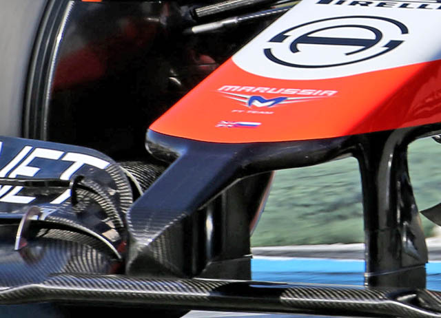 Here we get a look at the inboard suspension pickup points on the Ferrari transmission used by Marussia. Note the base of the y-lon rear wing support on the top of the rear crash structure. Something many teams copied during the season but was pioneered by Marussia.